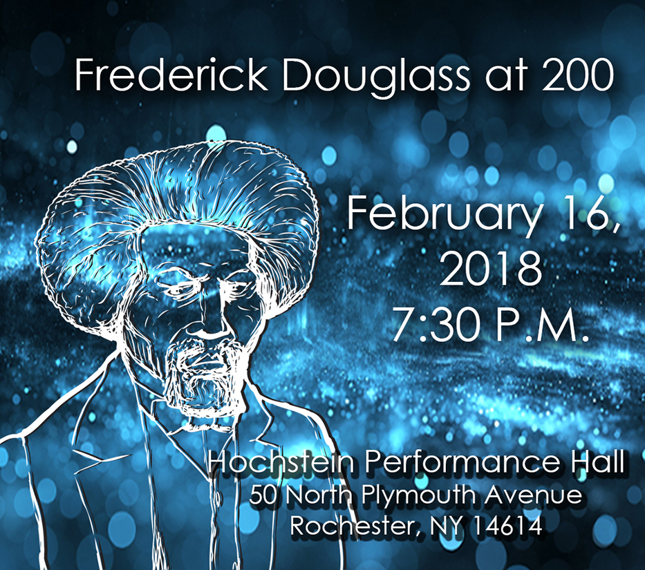 Statesman, orator, business and civic leader and Abolitionist, Frederick Douglass made his home in Rochester for a generation. The Rochester Oratorio Society mounts a Bicentennial commemoration of his life through readings, re-enactment and music, in FREDERICK DOUGLASS AT 200, Friday, February 16, 2018, 7:30 P.M., in the Hochstein Performance Hall, 50 Plymouth Avenue North, in Rochester. Tickets for this historic event ($25, $10 student with ID) are available from the ROS office at (585) 473-2234, through their web site, www.ROSsings.org, or online. Catherine Cerulli, Executive Director of the University of Rochester Susan B. Anthony Center, and Rochester Historical Society historian Dan Cody collaborate in a pre-concert chat and exhibit beginning at 7:00 P.M.